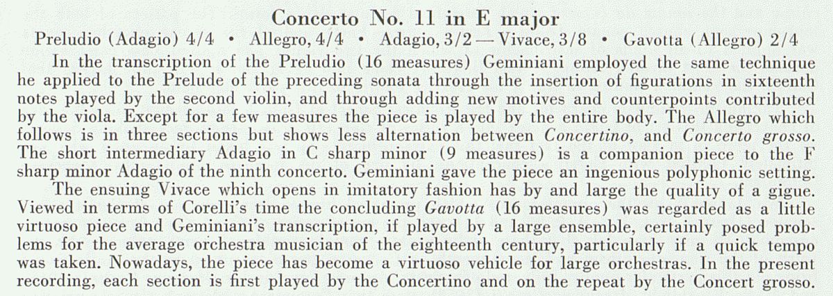 Arcangelo Corelli, transcription de Francesco Geminiani, Concerto grosso en mi majeur No 11, Op. 5, Renato Biffoli, Giuseppe Magnani, violon, Nereo Gasperini, violoncelle, Bruno Canino, clavecin, Gli Accademici di Milano, Dean Eckertsen, VOX VBX 38 (1. Preludio (Adagio) 02:16, 2. Allegro 02:51, 3. Adagio 00:43, 4. Vivace 01:56, 5. Gavotta (Allegro) 00:40)