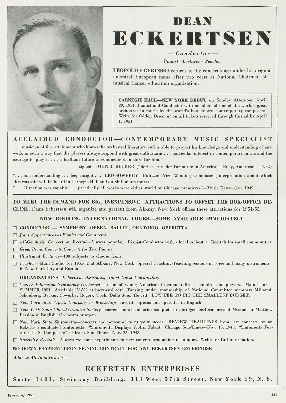 Un insert publicitaire paru en page 231 de la revue MUSICAL AMERICA, Février 1951