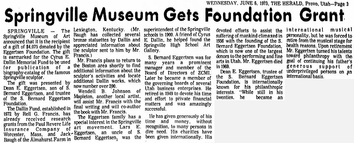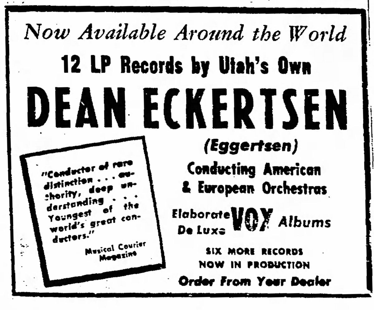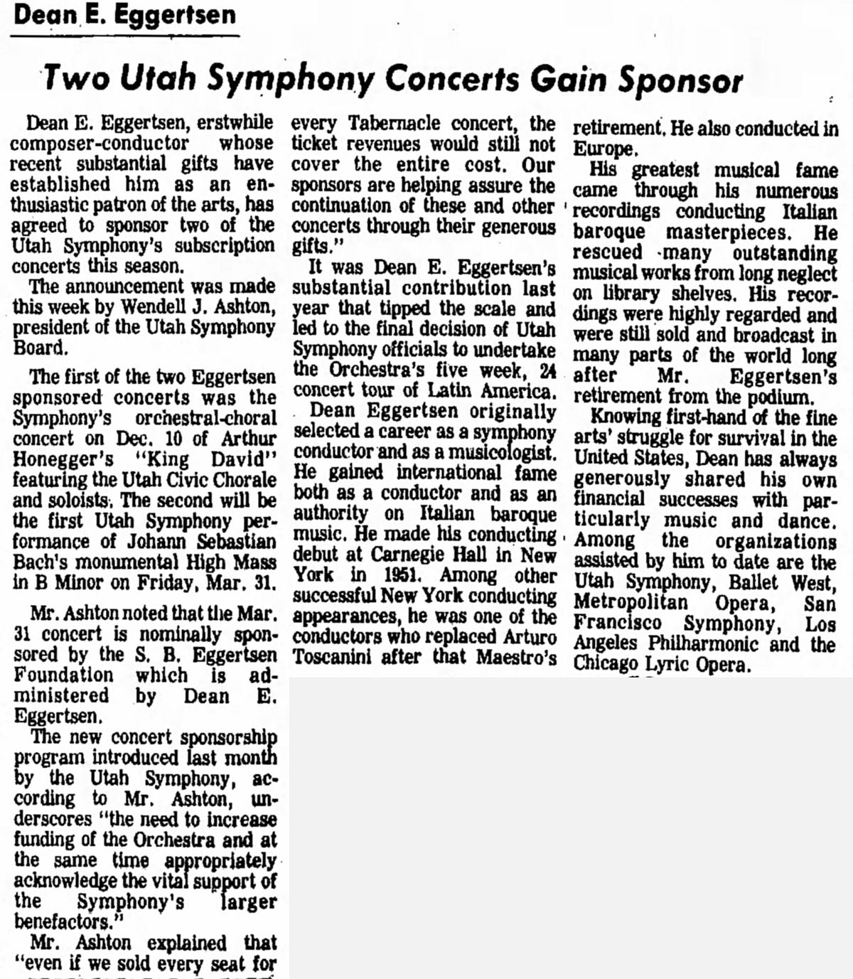 found: Deseret News, 6 September 2007 (Dean E. Eggertsen; Dean Edwin Eggertsen; died at age 79; born Salt Lake City, Utah; classical musician, symphony conductor and musicologist; photographer; lived in Midvale, Utah) [...]"