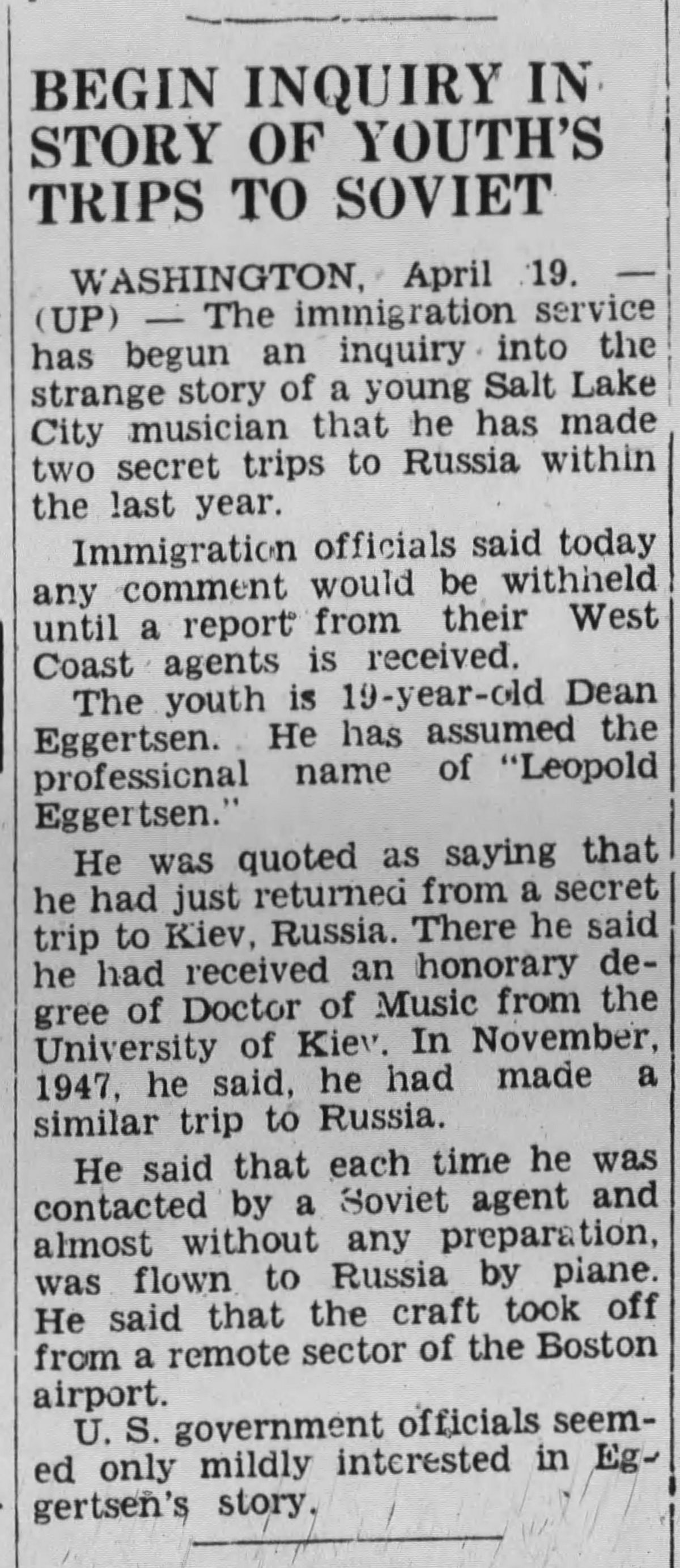 Sur les voyages en Russie de Dean Eggertsen, un extrait du journal "The Ogden Standard Examiner" 16 avril 1948, page 1
