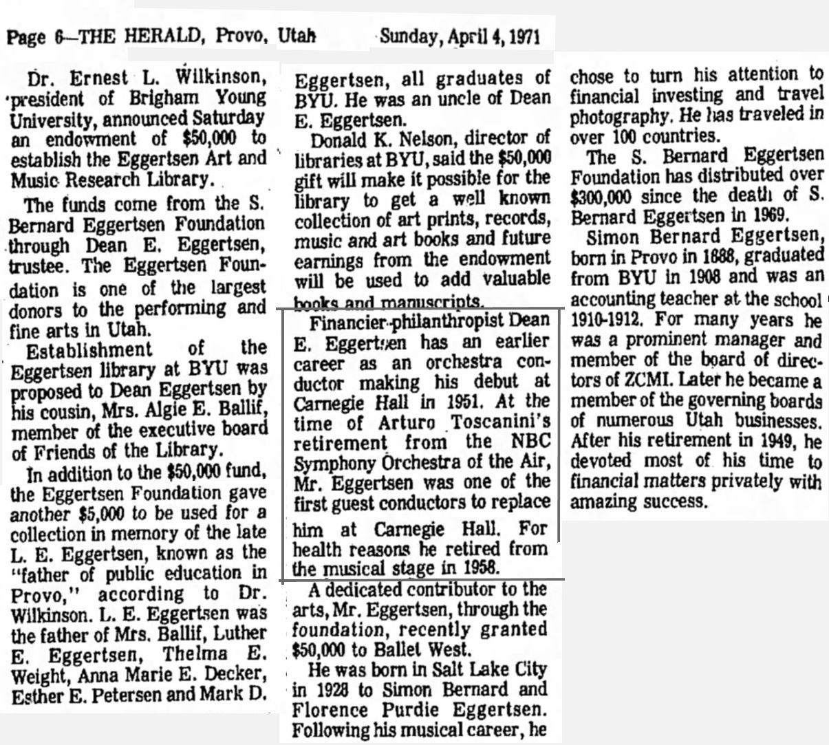 Vers le début des années 1970 Dean Eckertsen est actif sous le nom de Dean Eggertsen, pour - entre autres - administrer les activités de la fondation S. Bernard Eggertsen: