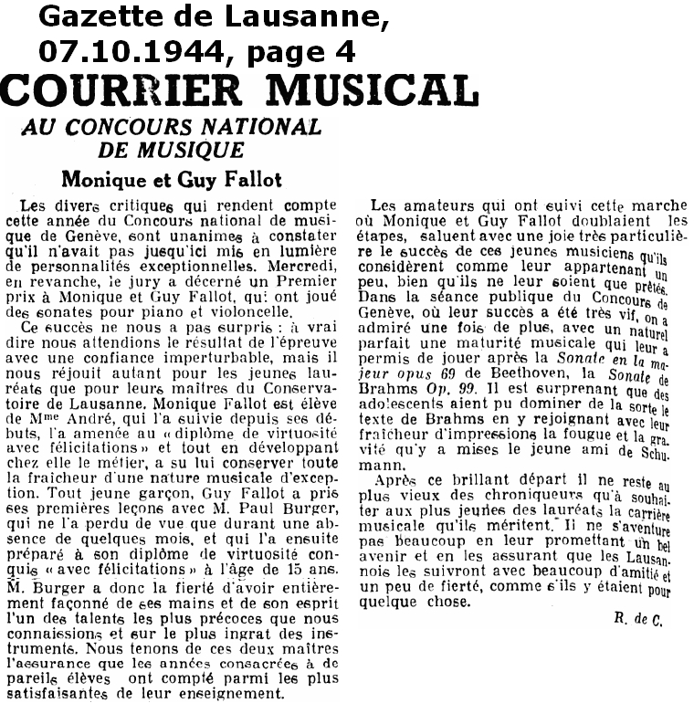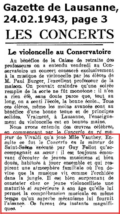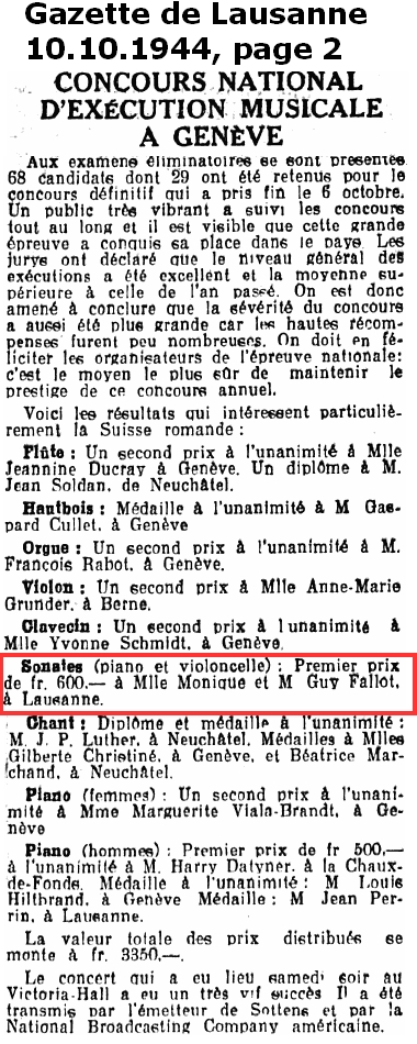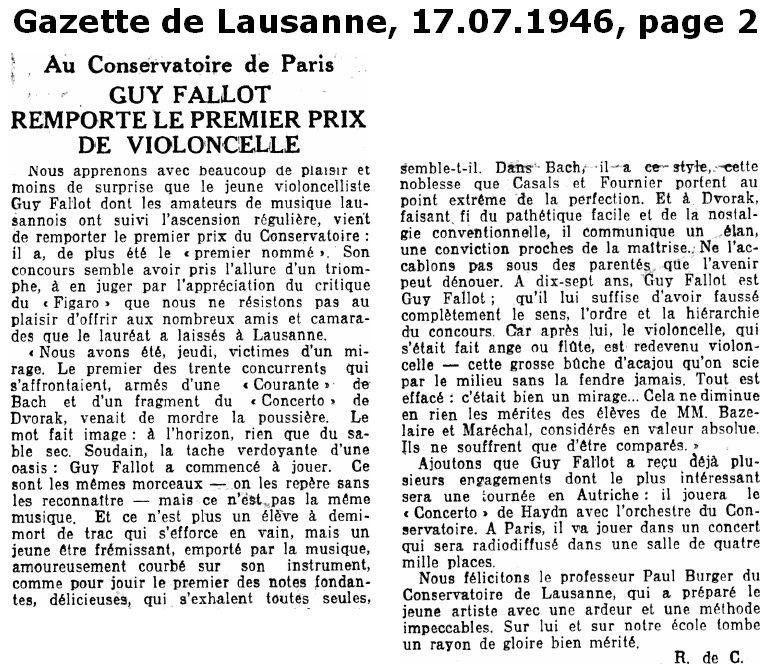 En 1946 déjà, il remporte le premier prix en violoncelle du Conservatoire de Paris. Un commentaire élogieux paru dans la Gazette de Lausanne resp. Le Figaro: