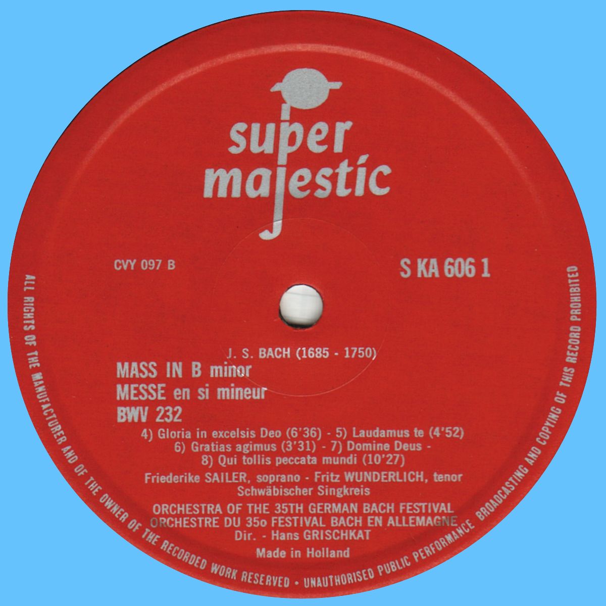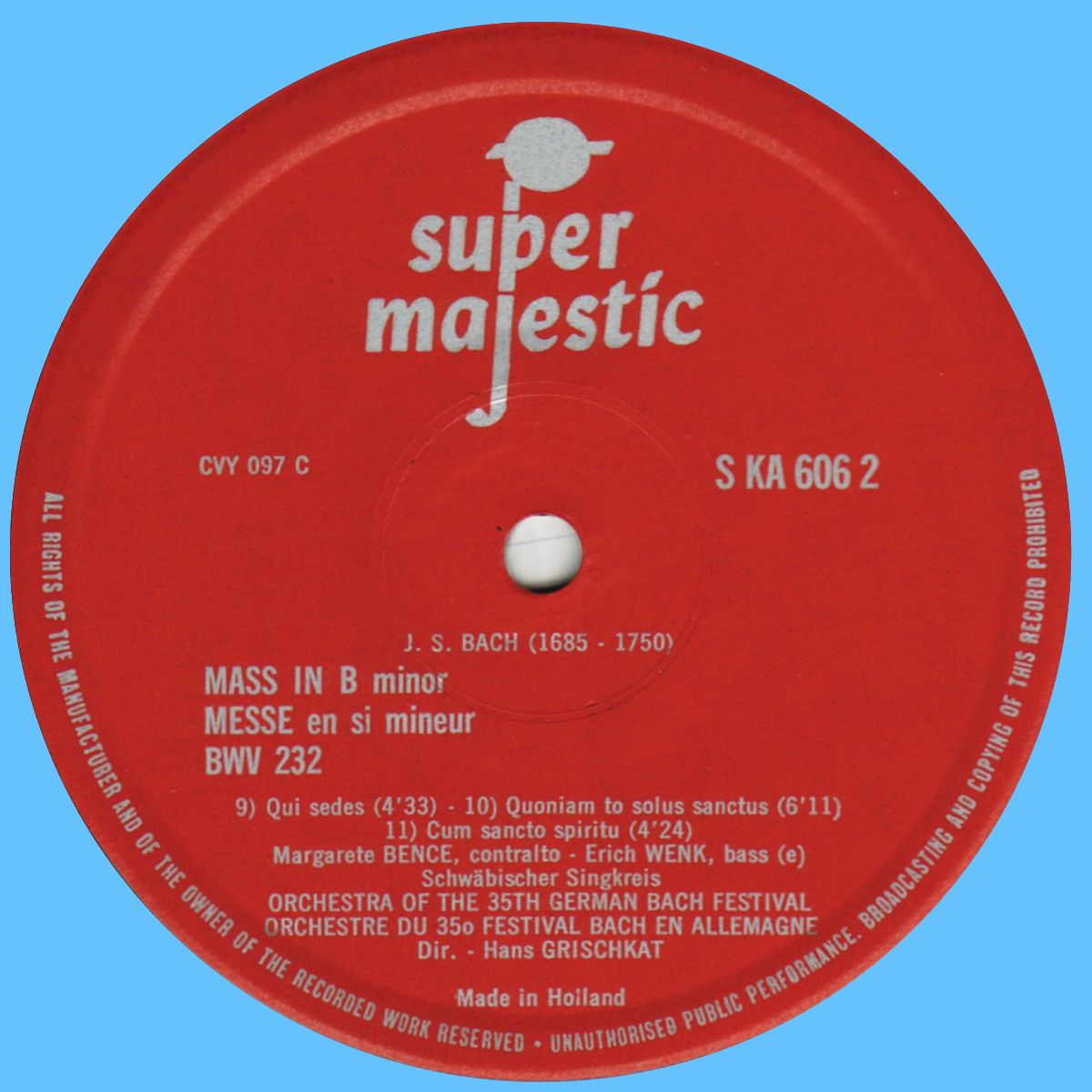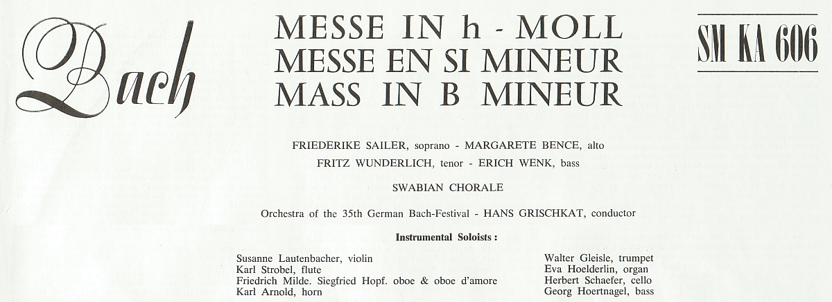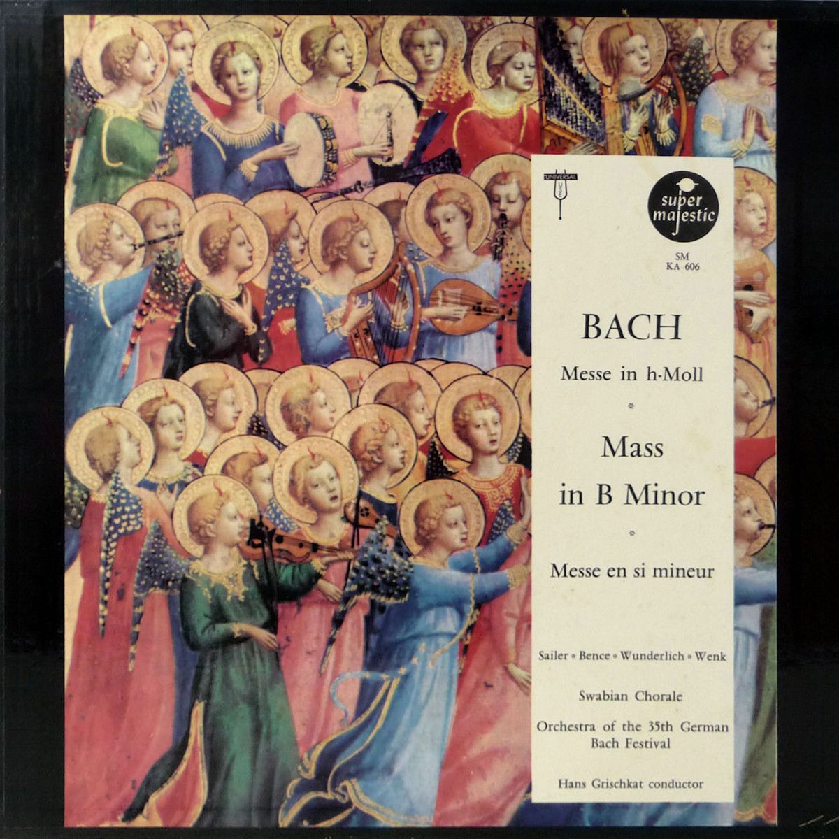 Johann Sebastian Bach, h-Moll-Messe (Hohe Messe in h-Moll) BWV 232, Friederike Sailer (S), Margarete Bence (A), Fritz Wunderlich (T), Erich Wenk (B), Walter Gleisle, trompette, Karl Strobel, flûte, Karl Arnold, cor, Friedrich Milde, hautbois, Siegfried Hopf, hautbois d'amour, Suzanne Lautenbacher, violon, Herbert Schäfer, violoncelle, Georg Hörtnagel, contrebasse, Eva Hölderlin, orgue, Schwäbischer Singkreis, Orchester des 35. deutschen Bachfestes 1958, Hans Grischkat, Super Majestic SM KA 606
