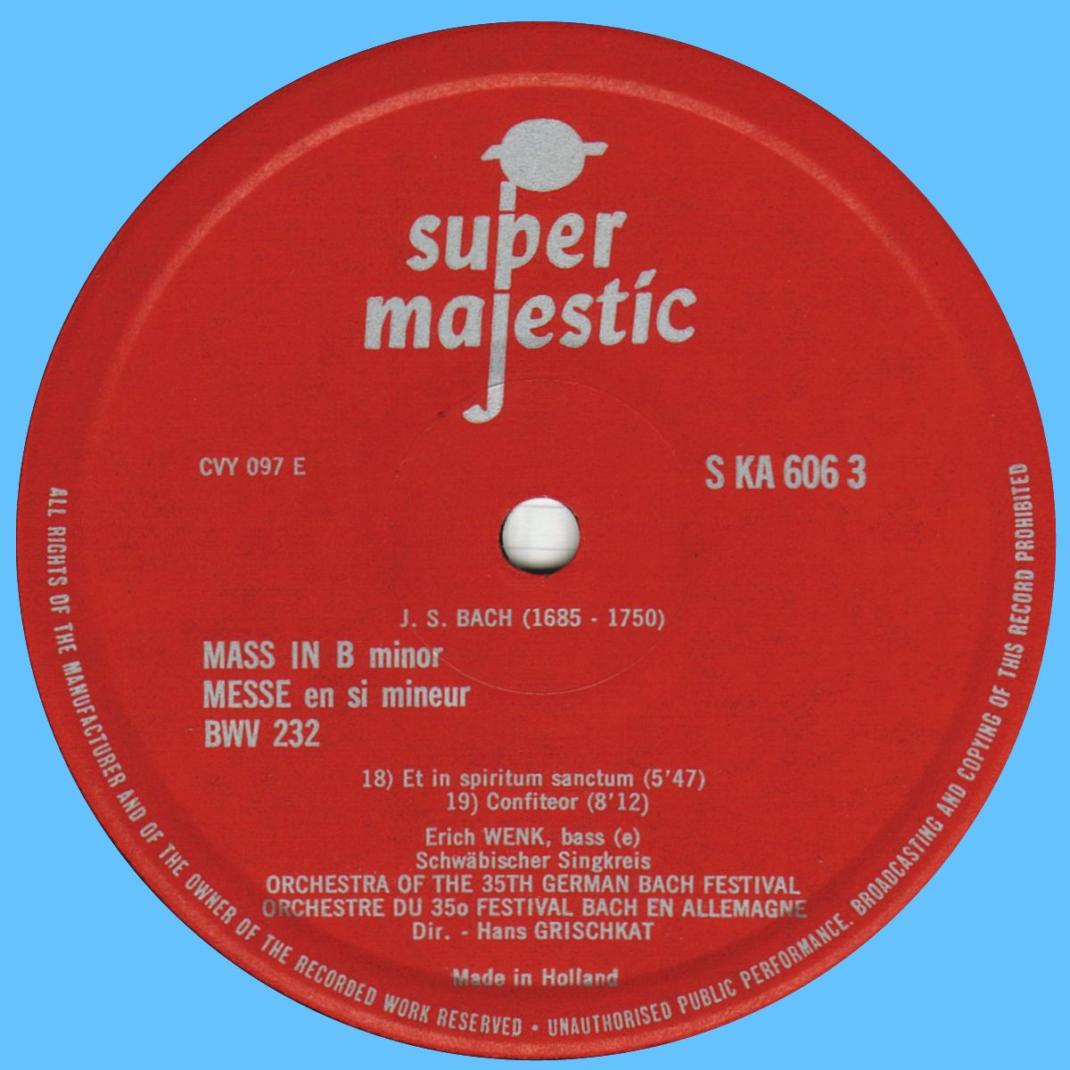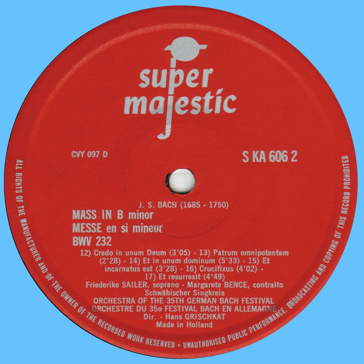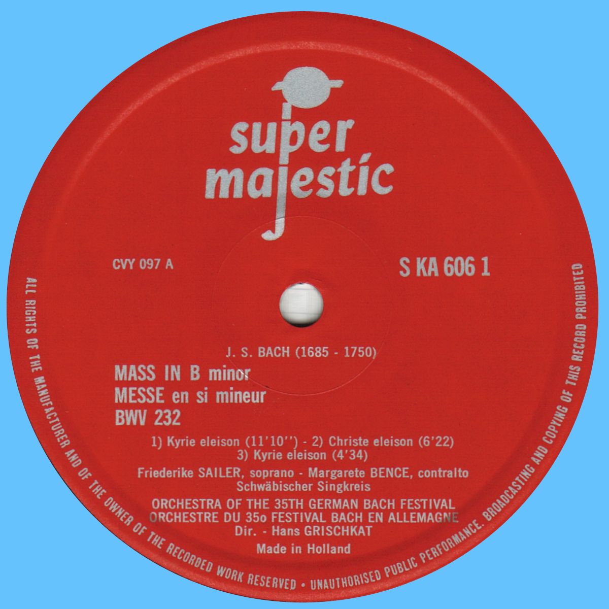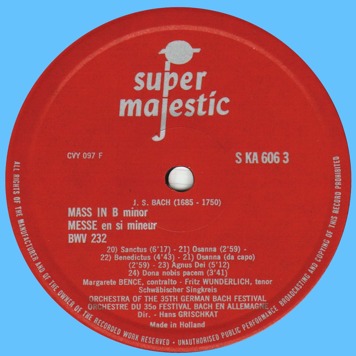 Johann Sebastian Bach, h-Moll-Messe (Hohe Messe in h-Moll) BWV 232, Friederike Sailer (S), Margarete Bence (A), Fritz Wunderlich (T), Erich Wenk (B), Walter Gleisle, trompette, Karl Strobel, flûte, Karl Arnold, cor, Friedrich Milde, hautbois, Siegfried Hopf, hautbois d'amour, Suzanne Lautenbacher, violon, Herbert Schäfer, violoncelle, Georg Hörtnagel, contrebasse, Eva Hölderlin, orgue, Schwäbischer Singkreis, Orchester des 35. deutschen Bachfestes 1958, Hans Grischkat, Super Majestic SM KA 606