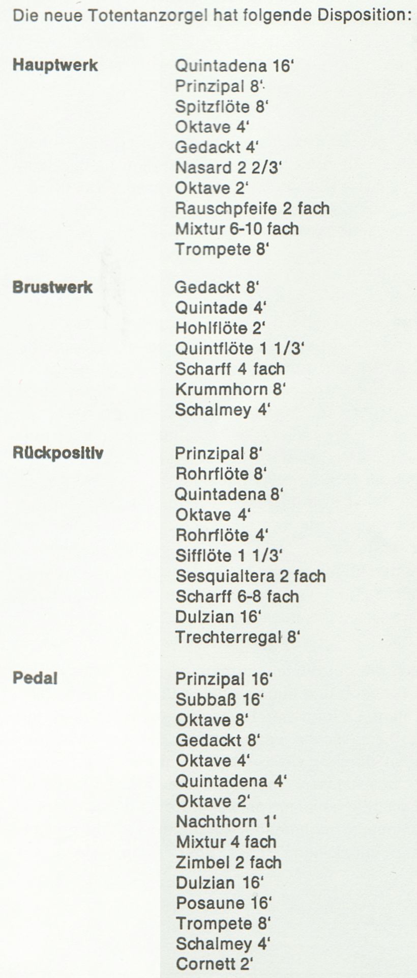 "[...] Die heute in der Marienkirche zu Lübeck stehende TOTENTANZ-ORGEL, auf der sämtliche Aufnahmen dieser Kassette gespielt wurden, ist die Rekonstruktion einer alten gotischen Orgel. Diese war im Jahre 1477 von Johannes Stephani vollendet worden. In einer Seitenkapelle der großen Kirche angebracht, erhielt sie bald ihren Namen nach dem „Totentanz“, der in den Pestjahren 1463 und 1464 dort aufgemalt worden war.