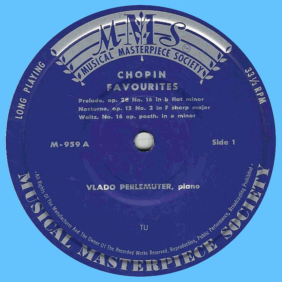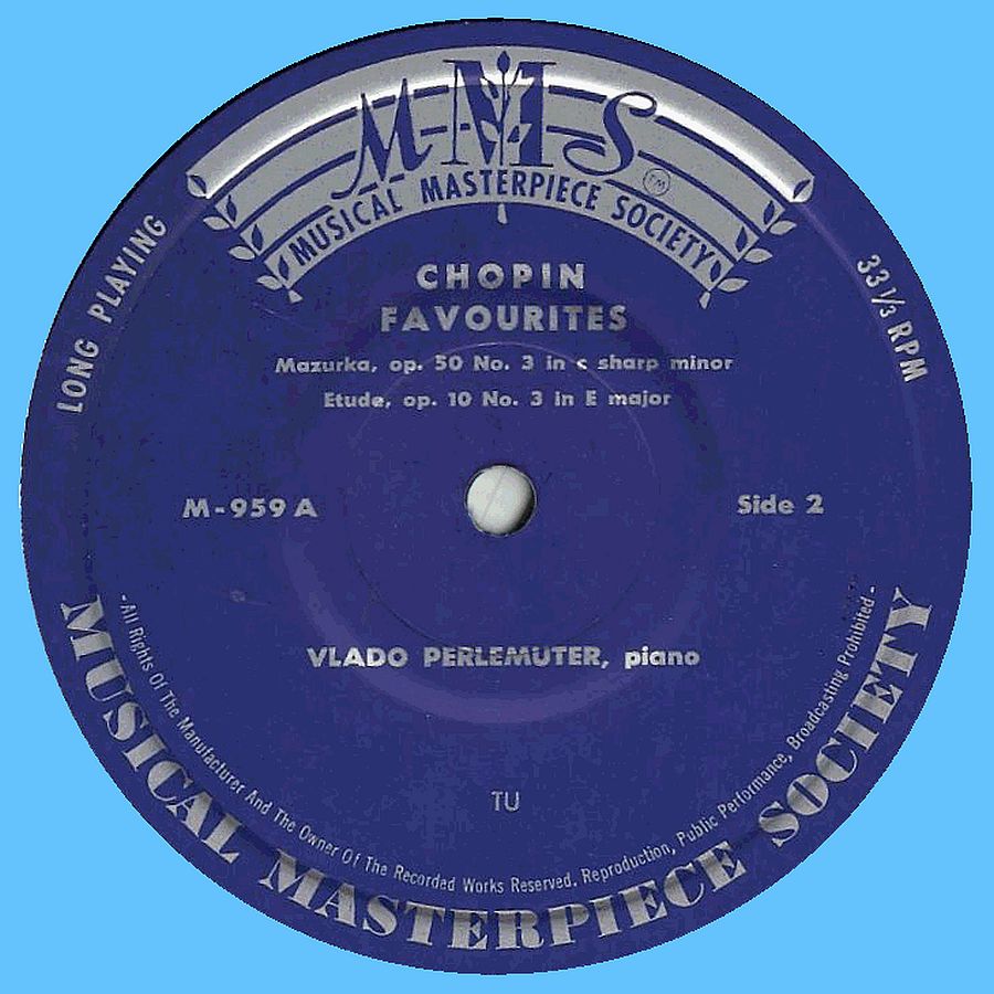 Ce petit disque 17 cm MMS 959 de Vlado PERLEMUTER a été réédité dans différents pays, je n'ai toutefois pas pu trouver de données concrètes sur les date et lieu d'enregistrement, ni si ces 5 pièces ont été enregistrées spécialement pour ce disque ou reprises d'autres publications. D'après les diverses informations que j'ai pu trouver sur le WEB - voir plus particulièrement à partir de cette page du site www.45cat.com - le disque MMS 959 a été publié pour la première fois en 1961: si une personne visitant cette page devait en savoir plus, toutes informations m'intéressent -> Vos remarques!.