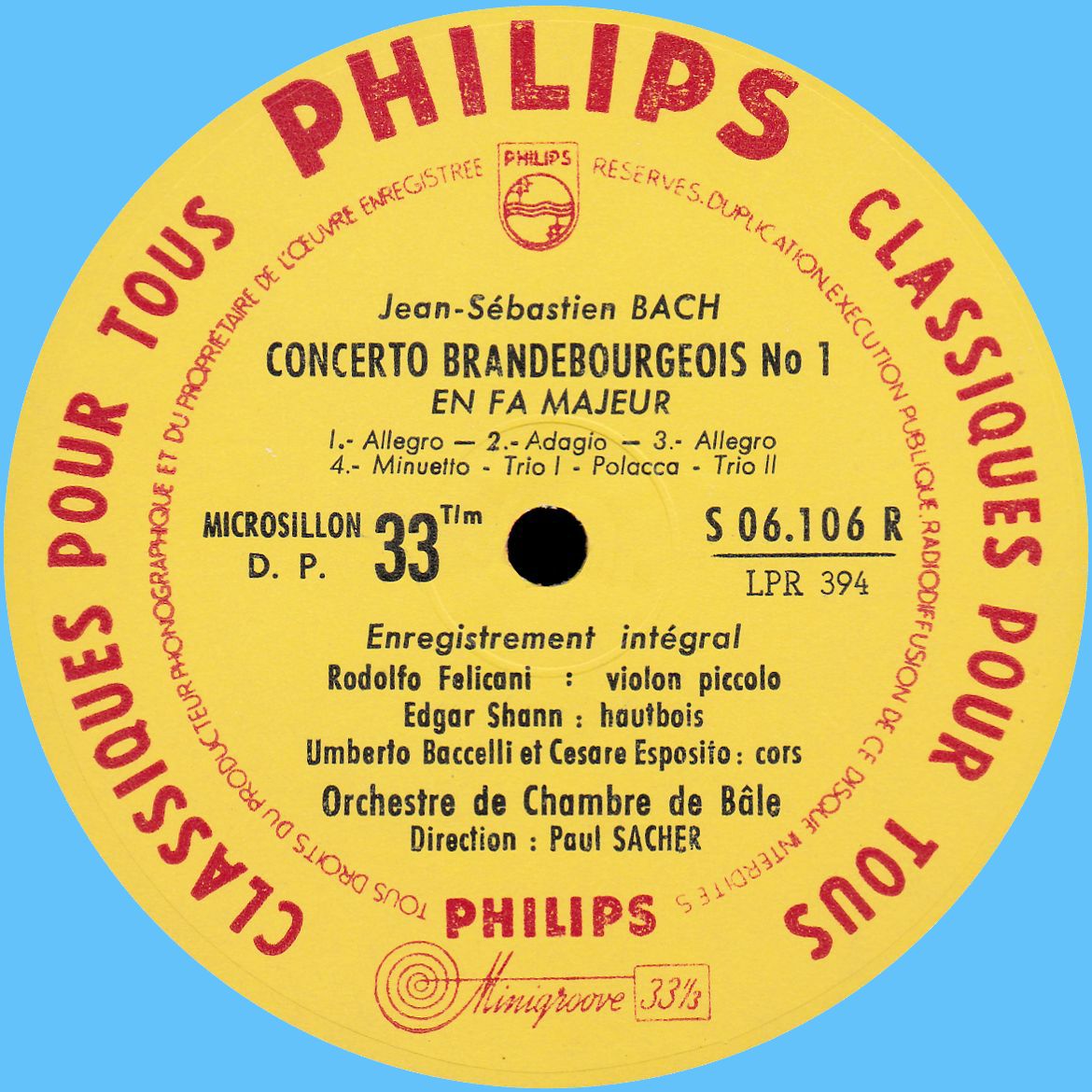 Johann Sebastian Bach, Brandenburgisches Konzert Nr. 1 in F-Dur, BWV 1046, Rodolfo Felicani, Violino piccolo, Edgar Shann, Oboe, Umberto Bacelli, Cesare Esposito, Horn, Basler Kammerorchester, Paul Sacher, 12.04.1954, Konservatorium der Gesellschaft der Musikfreunde in Wien (Universität für Musik und darstellende Kunst Wien), Philips S 06.106/107/108 R (1. (Allegro) 04:46, 2. Adagio 04:26, 3. Allegro 05:03, 4. Menuetto und Trio I - Menuetto und Polacca - Menuetto, Trio II und Menuetto 07:45)