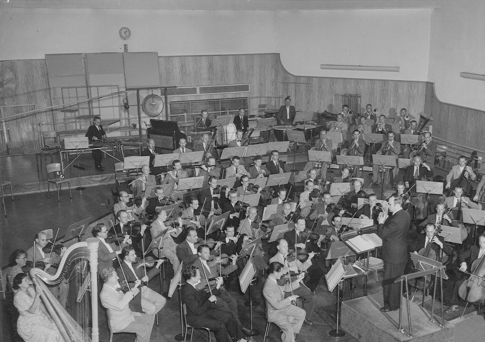 Le «Omroeporkest» dirigé par Henk SPRUIT, une photo prise dans un studio de la «Katholieke Radio Omroep (KRO)» dans les années 1950, venant de la collection privée de son fils Jop Spruit, ref. Christien bolt 4.