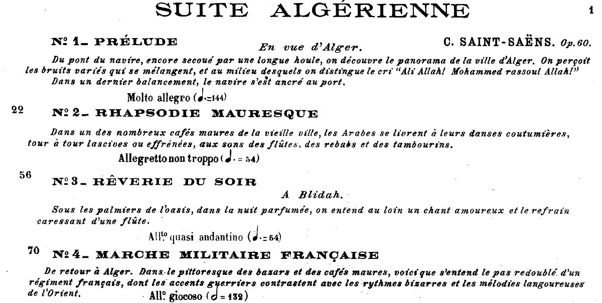 Sa Suite algérienne, qui inclut des airs entendus pendant ce premier séjour, fut en fait écrite à Boulogne en 1880. Elle est formée de 4 pièces: