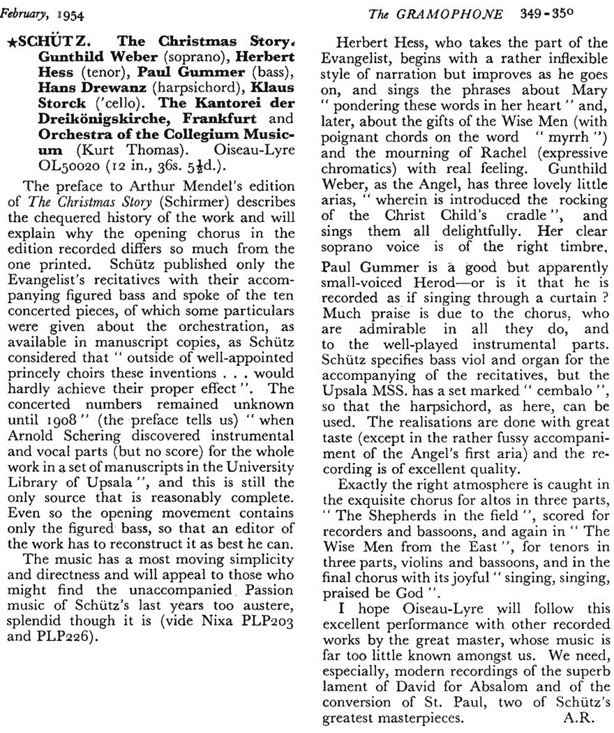 Heinrich Schütz, Historia der Geburt Christi (Weihnachtshistorie), SWV 435, Gunthild Weber (S), Herbert Hess (T), Paul Gümmer (B), Hans Drewanz, clavecin, Klaus Storck, violoncelle, Kantorei der Dreikönigskirche Frankfurt, Collegium Musicum, Kurt Thomas, L'Oiseau-lyre OL 50020, P 1953